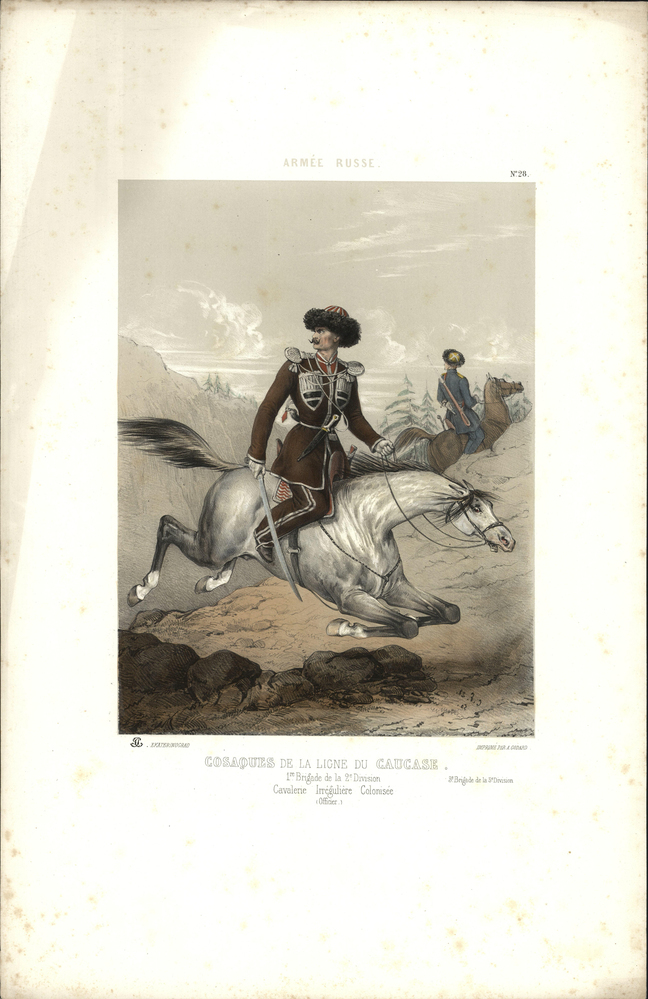 titel midden onder de afbeelding: Cosaques de la ligne du Caucase. 1re Brigade de la 2e Division Cavalerie Irrégulière Colonisée (Officier.)