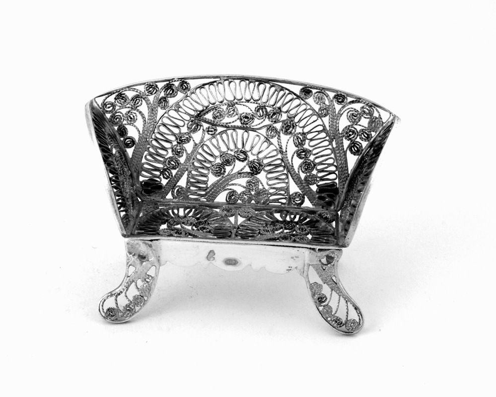 Tweezitsbank met hoge rugleuning; zitting, rug, armleuningen en voorpoten ingevuld met filigrain.
