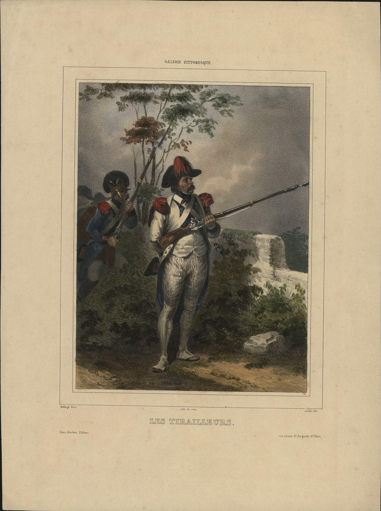 opschrift midden onder afbeelding: LES TIRAILLEURS.