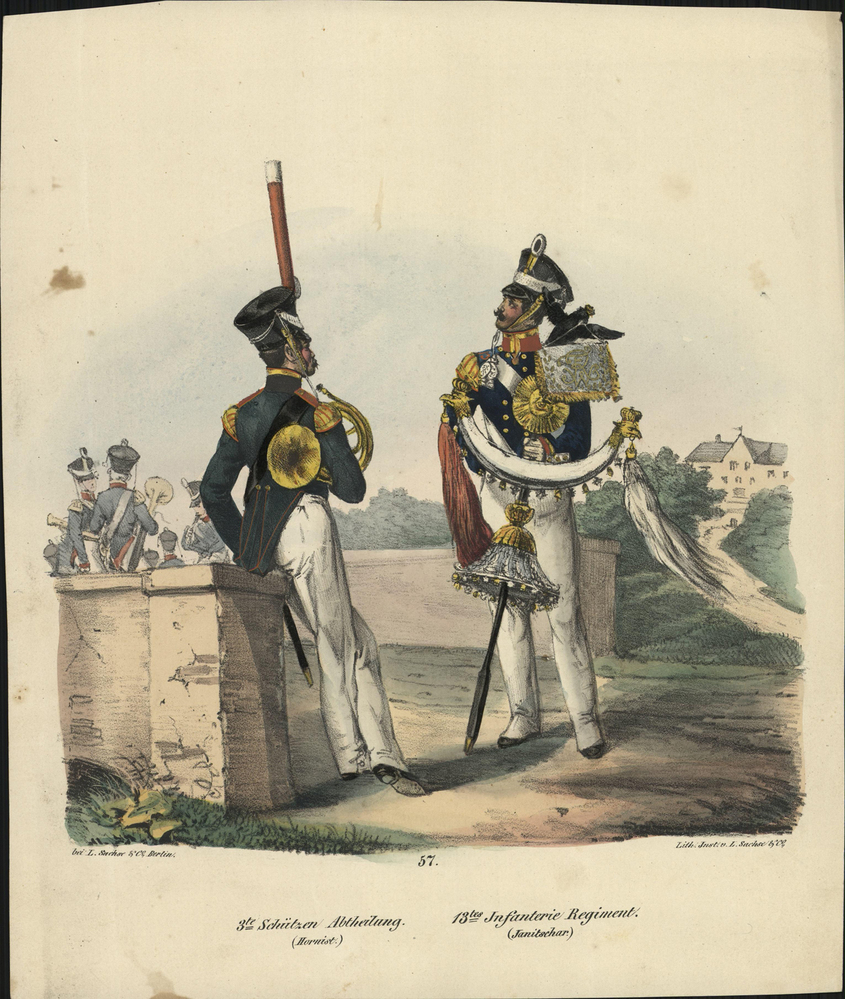 - opschrift onder afbeelding: 3te. Schützen Aftheilung./ (Hornist.) - 13tes. Infanterie Regiment./ (Janitschar).