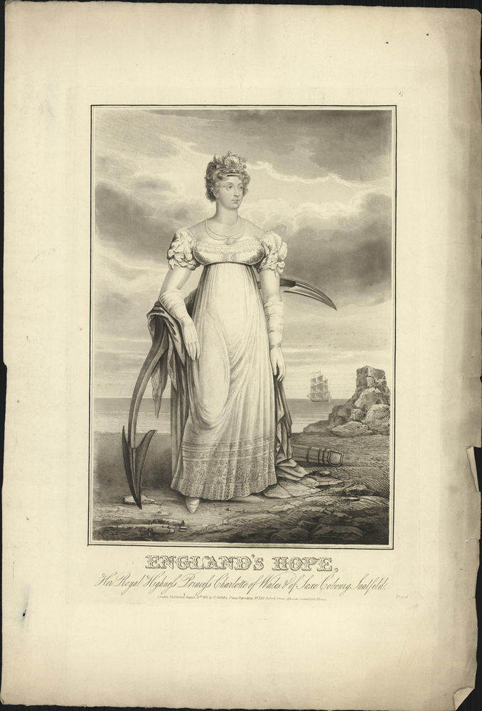 - opschrift midden onder afbeelding: ENGLAND'S HOPE,/ Her Royal Highness Princess Charlotte of Wales & of Saxe Cobourg Saalfeld.