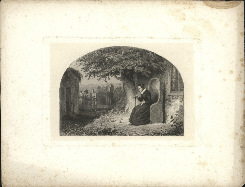 oude vrouw met stok in een hoge rieten stoel bij een huis onder een perenboom- Trefwoorden