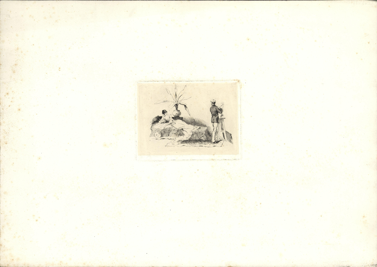 dame op een sofa bij een plant in een pot poseert voor een beeldhouwer- Trefwoorden