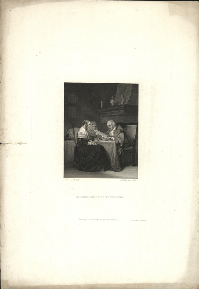 opschrift midden onder de afbeelding in de plaat: DE GODSDIENSTIGE VOORLEZING. / Vereeniging tot bevordering van Beeldende Kunsten 1850.