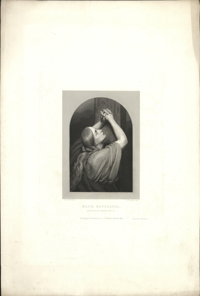 opschrift m.o. de afbeelding: Maria Magdalena / Evangelie van Johannes XIX v.25. / Vereeniging ter bevordering van Beeldende Kunsten 1849. / Gedrukt door J.F. Brugman. - aangetroffen 1985-02