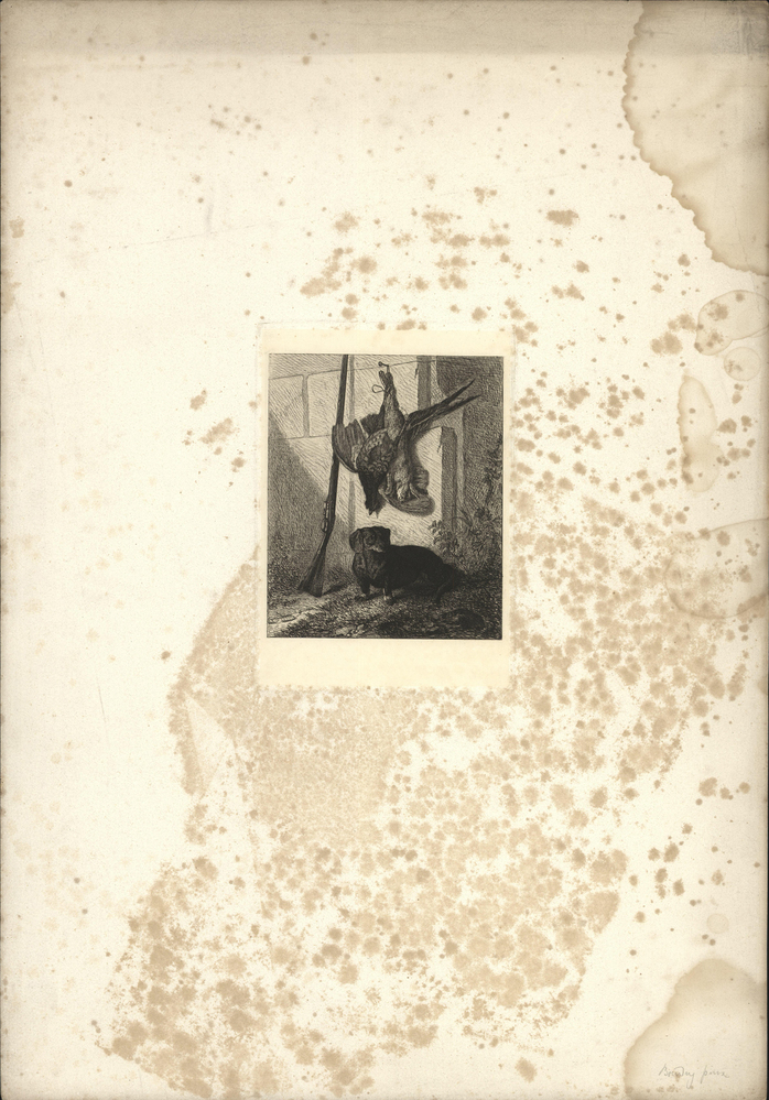 Een konijn en een patrijs hangen met een poot aan een touwtje als jachtbuit boven een tekkel. Daarnaast staat een jachtgeweer tegen een muur.- Trefwoorden