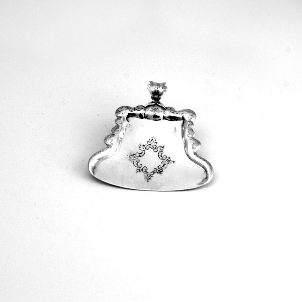 Blik met licht gebogen onderzijde; de drie overige zijden gecontourneerd en gedreven, oorringvormig en gecontourneerd, graveringen op bovenzijde blad C-vormig, op de gedreven randen en oor een gegraveerde fantasieversiering.