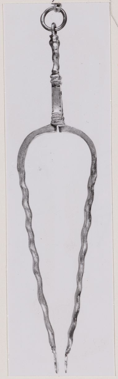 Vuurtang met ronde schouders en lange getorste benen, vierkant geprofileerde greep met ophangring.
