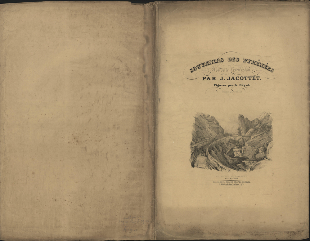 - titel boven de afbeelding: Souvenirs des Pyrénées Nouvelle Excursion par J. Jacottet. Figures par A. Bayot. Deuxième partie.: titelblad