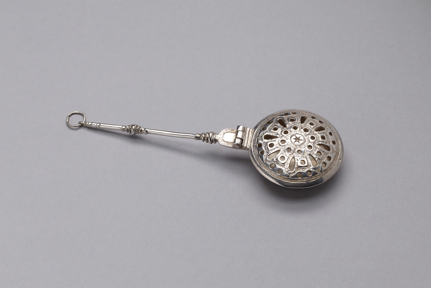 Ronde pan met vlakke bodem en wand met omgeslagen rand, waarop een scharnierend opengewerkt en gewelfd deksel ligt; onder scharnierlid begint de ronde gladde, ingekorte steel versierd met gedraaide ringen-knoppen en het uiteinde voorzien van een oog met ophangring.