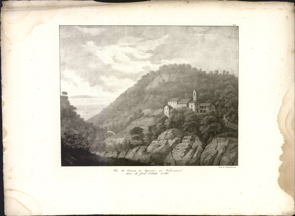 - titel midden onder de afbeelding: Vue du Couvent des Capucins, au Vescovato dans le fond l'Isle d'Elbe