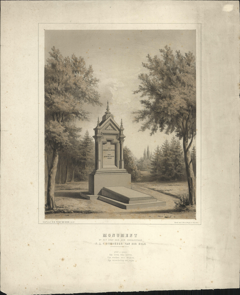 opschrift midden onder afbeelding: MONUMENT/ OP HET GRAF VAN DEN HOOGLEERAAR/ J.L.C. SCHROEDER VAN DER KOLK./ 1797-1862./ Zijn leven was lieven,/ Zijn werken was weldoen,/ Zijn vriendschap een zegen.