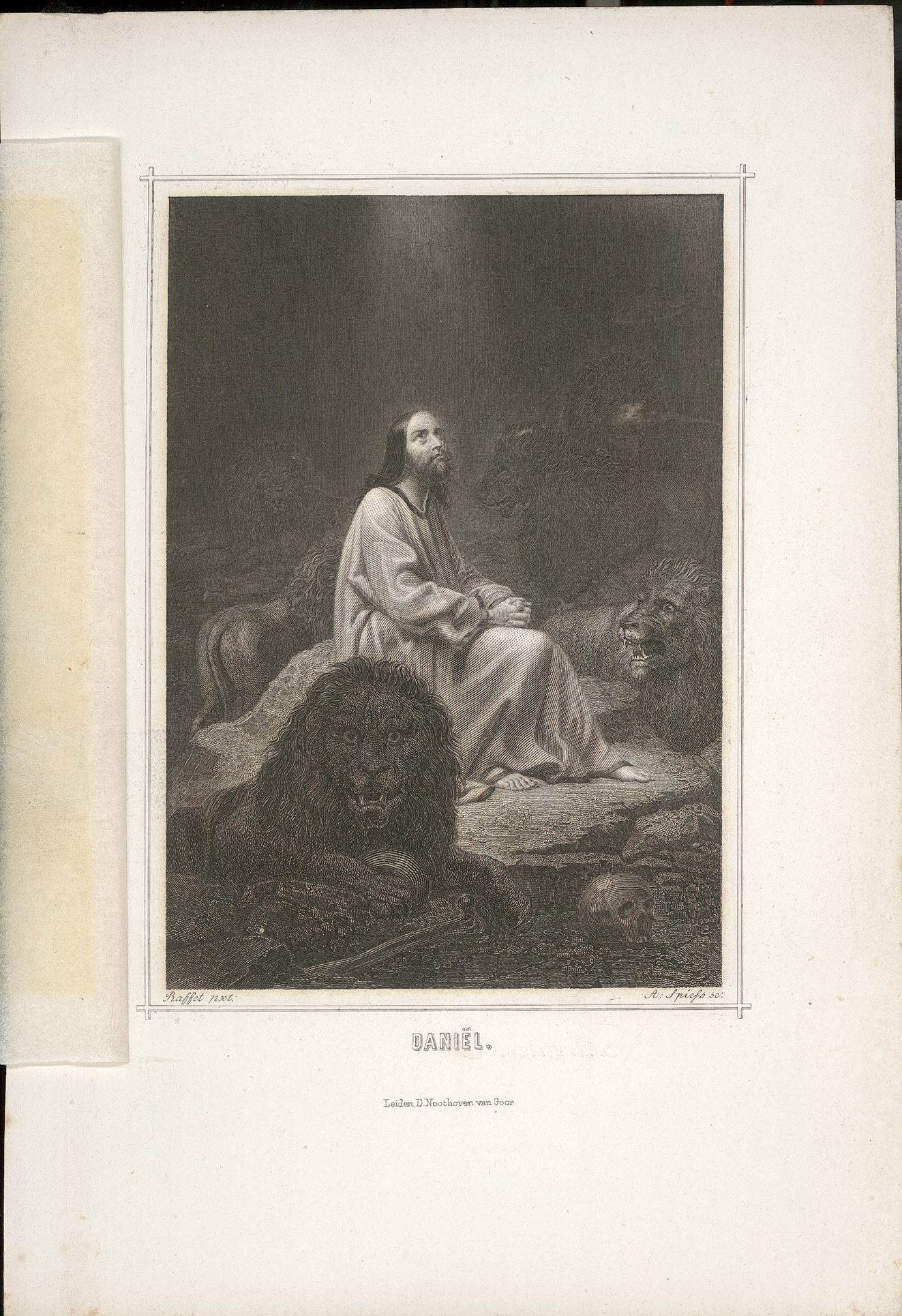 Daniël zit in de leeuwenkuil met drie leeuwen om hem heen. Op de voorgrond botten en een doodshoofd.- Trefwoorden