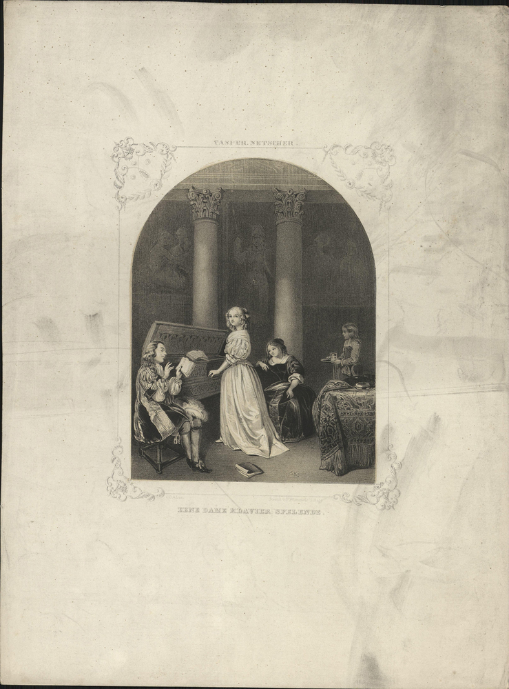 opschrift midden boven de afbeelding: Casper Netscher : naam schilder van de afbeelding