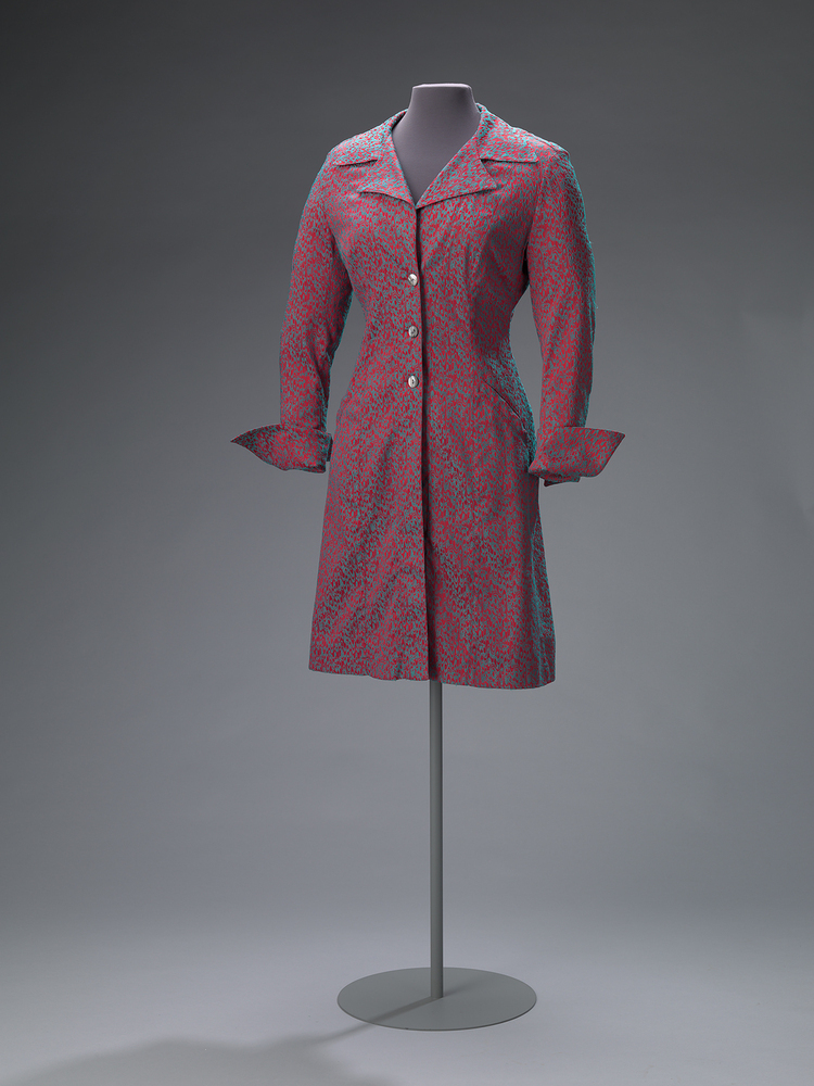 Deze jas of robe-manteau (jasjurk) is vervaardigd door het Amsterdamse modelabel Puck & Hans, opgericht door modeontwerpersechtpaar Puck Kroon (1941) en Hans Kemmink (1947). In 1967 openden Puck & Hans hun eerste winkel in Den Haag. Vanaf 1974 hadden ze ook een boetiek aan het Rokin te Amsterdam, met exclusieve en praktische kleding in moderne, eigenzinnige stoffen. De stijlvolle etalage aan het Rokin was voor voorbijgangers altijd een lust voor het oog. Begin 1998 is de winkel gesloten. De jas is gemaakt van rood satijn met een ingeweven groen golfmotief en kunststof knopen. ( Sarah Remmerts de Vries)