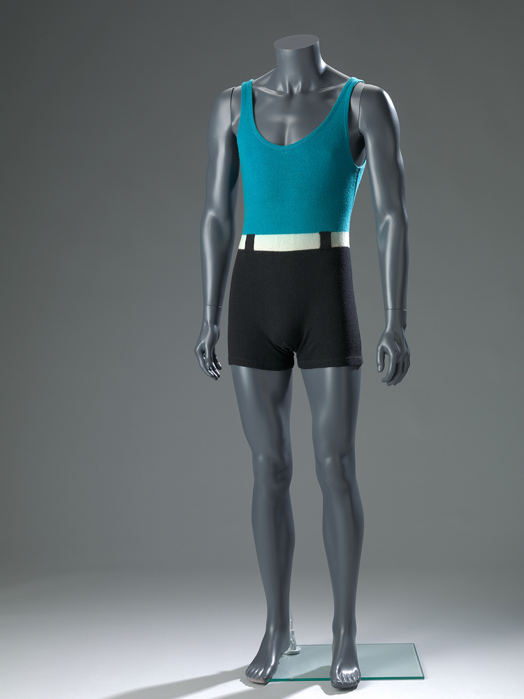 Vanaf de negentiende eeuw droegen mannen badhemden en badpakken tijdens het zwemmen. De badkleding was meestal gemaakt van wol, dat niet erg geschikt was voor het zwemmen. De stof was in de zomer erg warm en werd zwaar zodra het met water in aanraking kwam. Heren badpakken waren meestal rood, blauw of zwart van kleur. Dit wollen badpak uit de jaren ‘20 van de vorige eeuw combineert de kleuren blauw en zwart. Over de taille loopt een ingebreide witte baan, die mede dankzij de aanwezigheid van zwarte riemlussen de suggestie van een riem wekt. Er staat geen merkje in het badpak, maar wel een labeltje met de achternaam van de eigenaar: Pfeiffer. Een wijkzuster kreeg het badpak in de jaren ’90 aangeboden van het echtpaar Pfeiffer, dat in Bos en Lommer woonde. ( Sarah Remmerts de Vries)