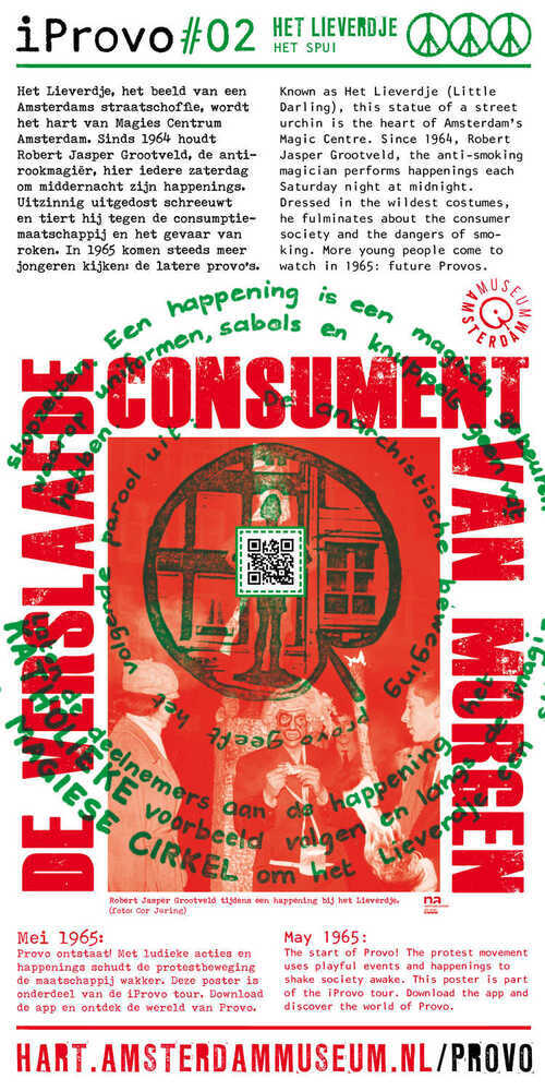 iProvo #02: Het Lieverdje, het beeld van een Amsterdams straatschoffie, wordt het hart van Magies Centrum Amsterdam. Sinds 1964 houdt Robert Jasper Grootveld, de anti-rookmagiër, hier iedere zaterdag om middernacht zijn happenings. Uitzinnig uitgedost schreeuwt en tiert hij tegen de consumptiemaatschappij en het gevaar van roken. In 1965 komen steeds meer jongeren kijken: de latere provo’s. ( Annemarie de Wildt)