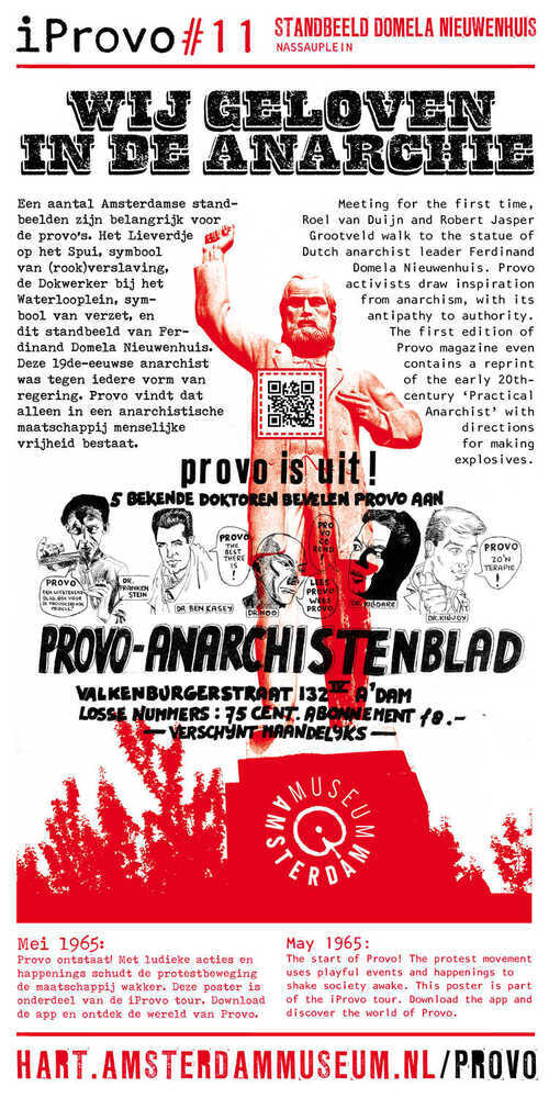 iProvo #11: Een aantal Amsterdamse standbeelden zijn belangrijk voor de provo’s. Het Lieverdje op het Spui, symbool van (rook)verslaving, de Dokwerker bij het Waterlooplein, symbool van verzet, en dit standbeeld van Ferdinand Domela Nieuwenhuis. Deze 19de-eeuwse anarchist was tegen iedere vorm van regering. Provo vindt dat alleen in een anarchistische maatschappij menselijke vrijheid bestaat. ( Annemarie de Wildt)