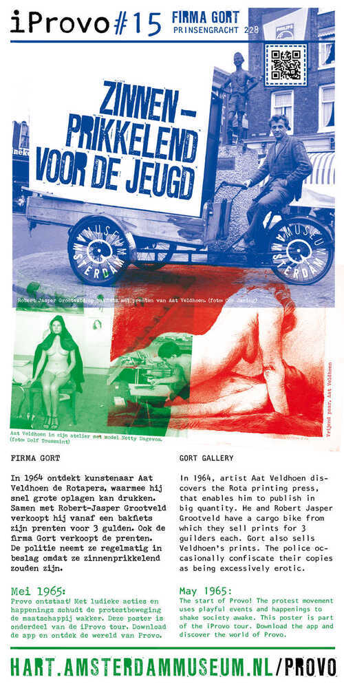 iProvo #15: In 1964 ontdekt kunstenaar Aat Veldhoen de Rotapers, waarmee hij snel grote oplagen kan drukken. Samen met Robert Jasper Grootveld verkoopt hij vanaf een bakfiets zijn prenten voor 3 gulden. Ook de firma Gort verkoopt de prenten. De politie neemt ze regelmatig in beslag omdat ze zinnenprikkelend zouden zijn. ( Annemarie de Wildt)