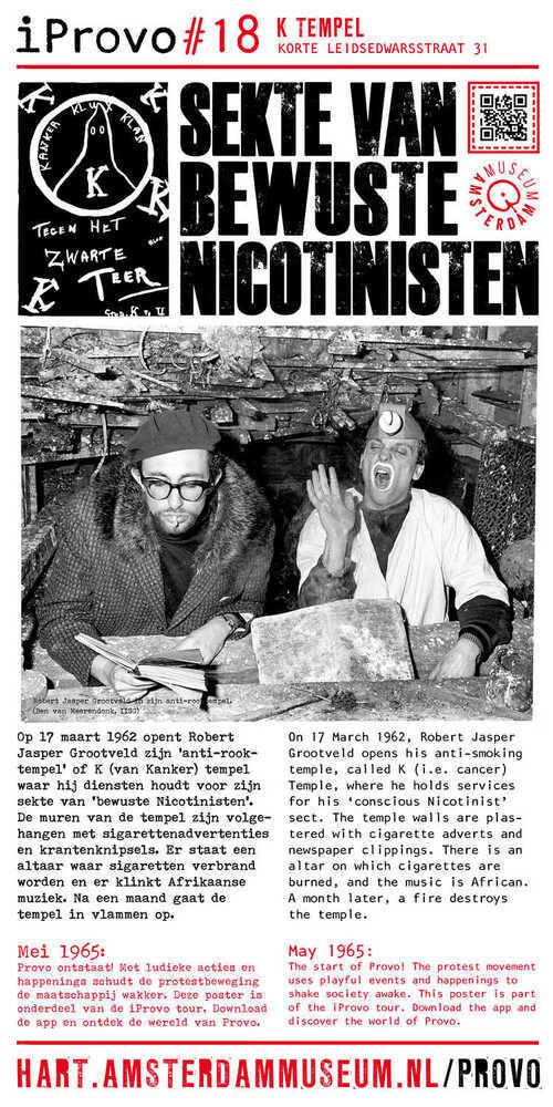 iProvo #18: Sekte van Bewuste Nicotinisten. Op 17 maart 1962 opent Robert Jasper Grootveld zijn ‘anti-rooktempel’ of K (van Kanker) tempel waar hij diensten houdt voor zijn sekte van ‘bewuste Nicotinisten’. De muren van de tempel zijn volgehangen met sigarettenadvertenties en krantenknipsels. Er staat een altaar waar sigaretten verbrand worden en er klinkt Afrikaanse muziek. Na een maand gaat de tempel in vlammen op. ( Annemarie de Wildt)