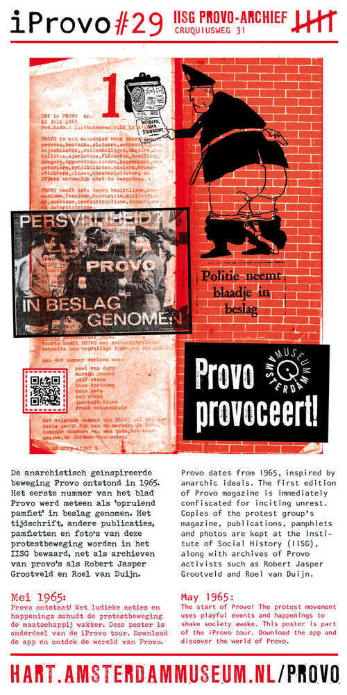 iProvo #29: De anarchistisch geïnspireerde beweging Provo ontstond in 1965. Het eerste nummer van het blad Provo werd meteen als ‘opruiend pamflet’ in beslag genomen. Het tijdschrift , andere publicaties, pamfletten en foto’s van deze protestbeweging worden in het IISG bewaard, net als archieven van provo’s als Robert Jasper Grootveld en Roel van Duijn. ( Annemarie de Wildt)