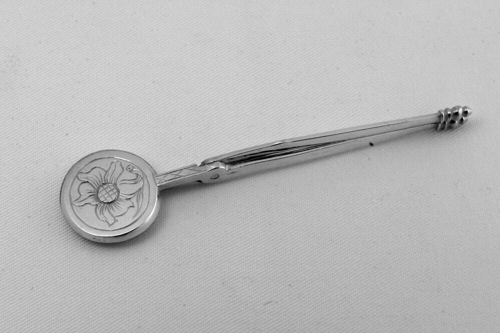 Wijfelijzer met twee ronde platen die aan beide zijden zijn gegraveerd met een bloemmotief in kader, geklonken draaipunt en platte benen eindigend in een knop.