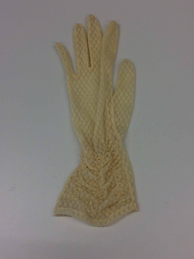 Handschoen (rechts) van lichtgele synthetische tricot, machinaal geborduurd met stippenmotief. Bovenop de pols gerimpeld met drie draden rimpelelastiek.