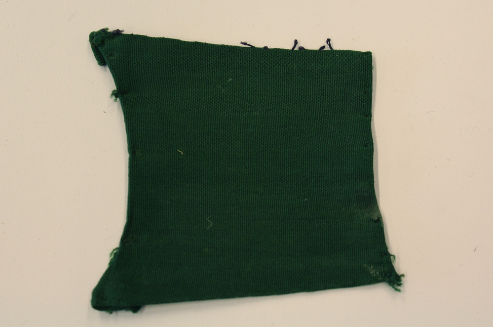 Fragment groene stoelbekleding met gaatjes aan twee zijden.- Trefwoorden