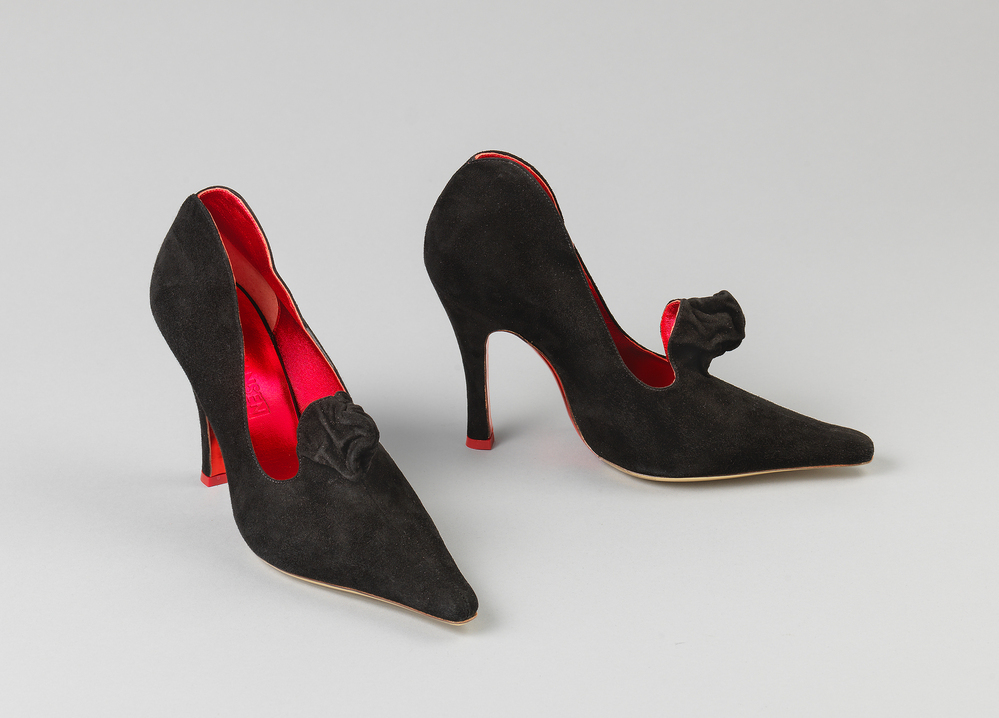 Schoenenontwerper Jan Jansen is sinds de jaren zestig een bekende naam in de Nederlandse modewereld. In 1991 maakt hij zijn eerste ontwerpen voor de schoenenserie Linea Erotica. Deze serie schoenen kent een knipoog naar erotiek, die naar voren komt in de sensuele vormen en thema’s van de pumps. Deze zwarte suede schoenen zijn een variatie op de ‘What’s this?’, een bijzondere pump met op het langgerekte voorblad een suggestief gevormd uitstulpsel, dat wel eens omschreven is als een ‘verschrompeld scrotum’. De binnenzijde van de pump is rood metallic gekleurd en in het voetbed is het logo ‘JANJANSEN’ aangebracht. De zool is half rood, half goud metallic van kleur en draagt een klein ingelegd suede hartje. De schoen is maat 38 en geproduceerd in Italië. ( Sarah Remmerts de Vries)