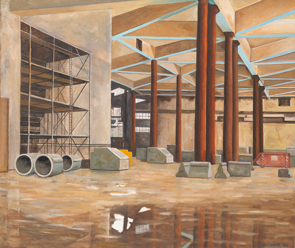 Ton Leenarts legt in 2011 een hal van het metrostation Centraal Station vast, die gereed gemaakt wordt voor de oplevering van de Noord/Zuidlijn. Tijdens de bouw wordt de hal ook wel de ‘ondergrondse kathedraal’ genoemd, een naam die de fantasie prikkelt. Het lijnenspel van de geometrische patronen in het hoge plafond, de lange rode pilaren en de bouwstelling links geven de voorstelling een bijzondere perspectiefwerking. Het water op de grond weerkaatst het licht dat door enkele ramen in de achtergrond naar binnen schijnt. Door de ruimte heen ligt uiteenlopend betonnen bouwmateriaal verspreid, rechts staat een rode afvalcontainer tegen de achterste pilaren. ( Sarah Remmerts de Vries)