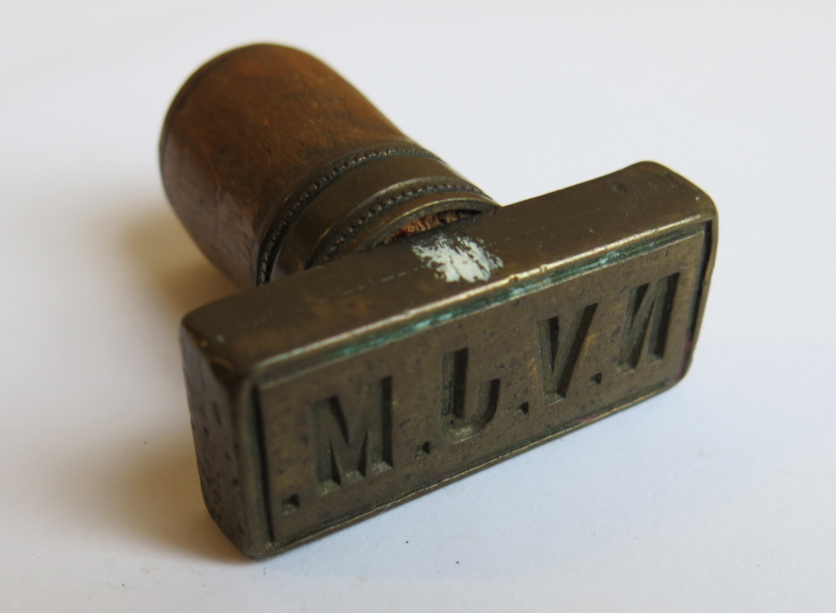 Dit cachet met monogram 'N.V.J.M.' is afkomstig uit een Amsterdams havenbedrijf, zoals die bestonden met namen als Blaauwhoedenveem, Groenhoedenveem, Leidsche Oranje Naussau Veem en anderen. Bij deze bedrijven kwamen producten als koffie, cacao, tabak, thee en specerijen in zakken en balen Amsterdam binnen. In het veem, een opslagplaats tussen verkoper en koper, werden ze gewogen en bemonsterd. De monsters werden in een monsterschaal gedaan, alvorens verdeeld te worden over katoenen monsterzakjes. Deze zakjes werden voorzien van de zegels van de partijen die toezicht hadden gehouden op het wegen en bemonsteren (koper, verkoper en onderhandelaar). Zo’n lakzegel werd aangebracht met een cachet als deze. Bij de overname van Blaauwhoedenveem door Pakhuismeesteren Rotterdam aan het begin van de jaren zeventig is dit cachet door een medewerker bewaard. ( Sarah Remmerts de Vries)