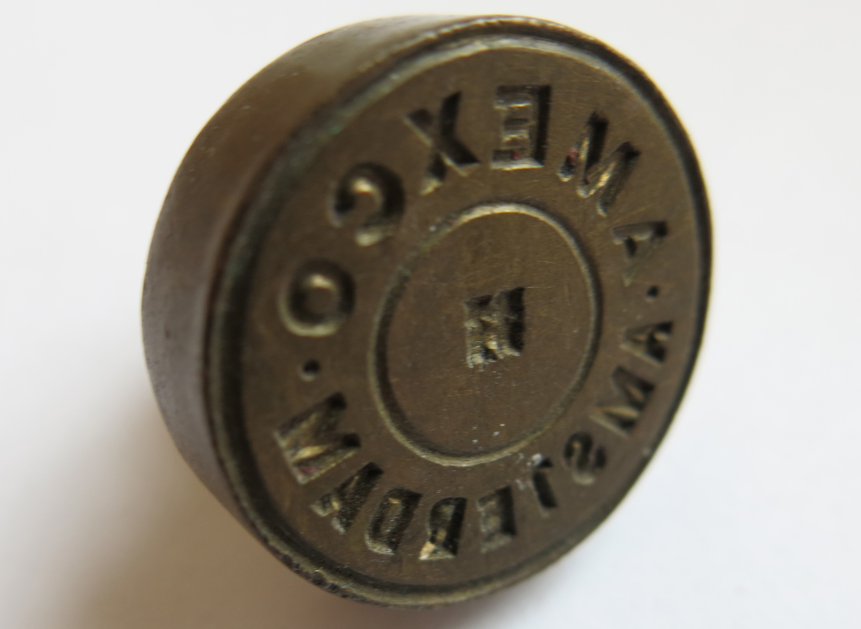 Dit cachet met het monogram 'Amexco Amsterdam' is afkomstig uit het bezit van de Amsterdamse vestiging van American Express Co. Cachets zoals deze werden gebruikt om lakzegels aan te brengen, bijvoorbeeld op monsterzakjes. Producten zoals koffie, cacao, tabak, thee en specerijen die in zakken en balen Amsterdam binnenkwamen, werden in het veem, een opslagplaats tussen verkoper en koper, gewogen en bemonsterd. De monsters werden in een monsterschaal gedaan, alvorens verdeeld te worden over katoenen monsterzakjes. Deze zakjes werden voorzien van de zegels van de partijen die toezicht hadden gehouden op het wegen en bemonsteren (koper, verkoper en onderhandelaar). Bij de overname van havenbedrijf Blaauwhoedenveem door Pakhuismeesteren Rotterdam aan het begin van de jaren zeventig is dit cachet door een medewerker bewaard. ( Sarah Remmerts de Vries)