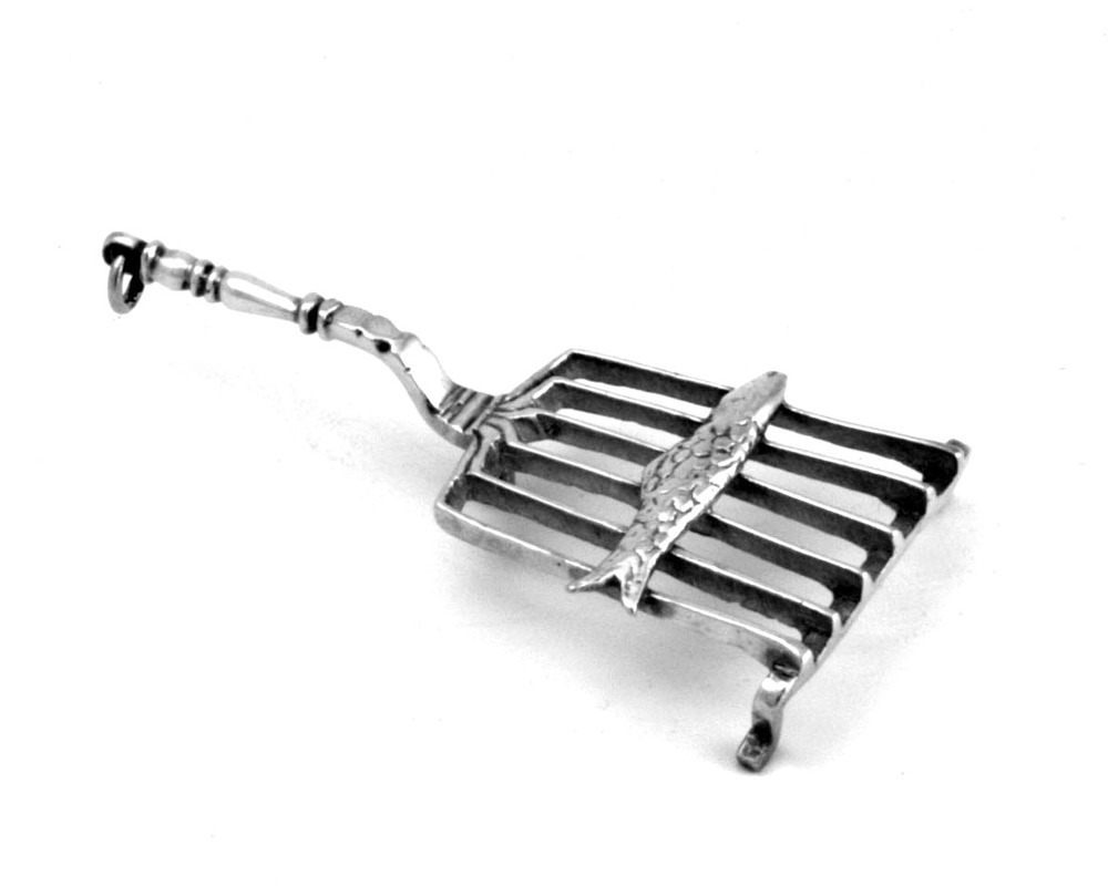 Treeft op drie poten, waarop een smalle lange vis (mogelijk snoek); rooster van zes spijlen, dubbel gebogen steel eindigend in een pilastervormig heft, voorzien van oog met ophangring.- Trefwoorden