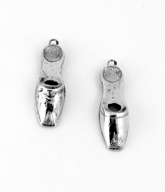Een paar muiltjes met een stompe neus, beide aan de hak voorzien van een oogje met ring, gladde zool met een hak, hiel en wreef bewerkt, mogelijk buitenlands souvenir of breipenhouders.