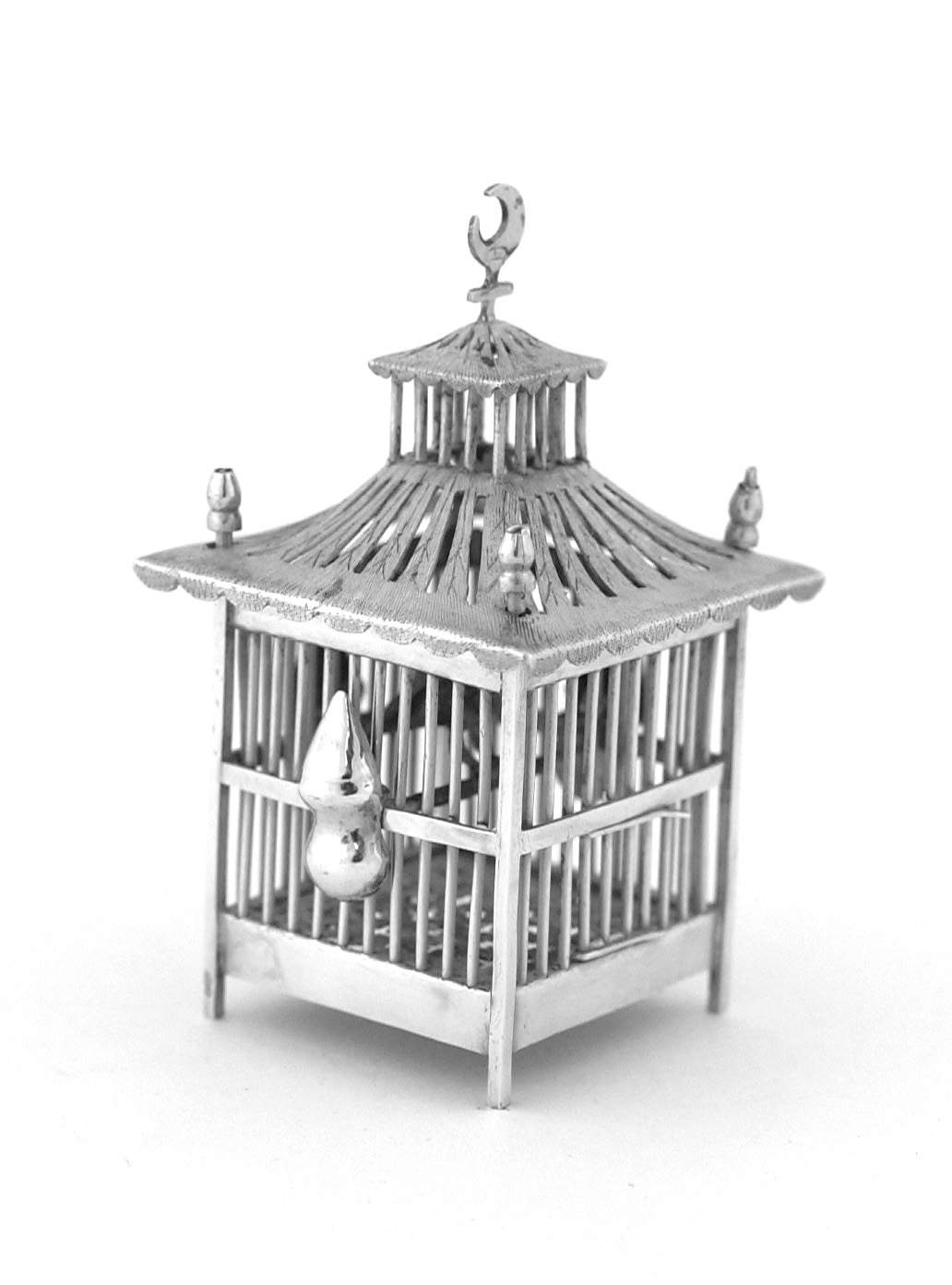 Vierkante kooi met vogel op een stok; op het dak een lantaarn en halvemaanvormige bekroning.