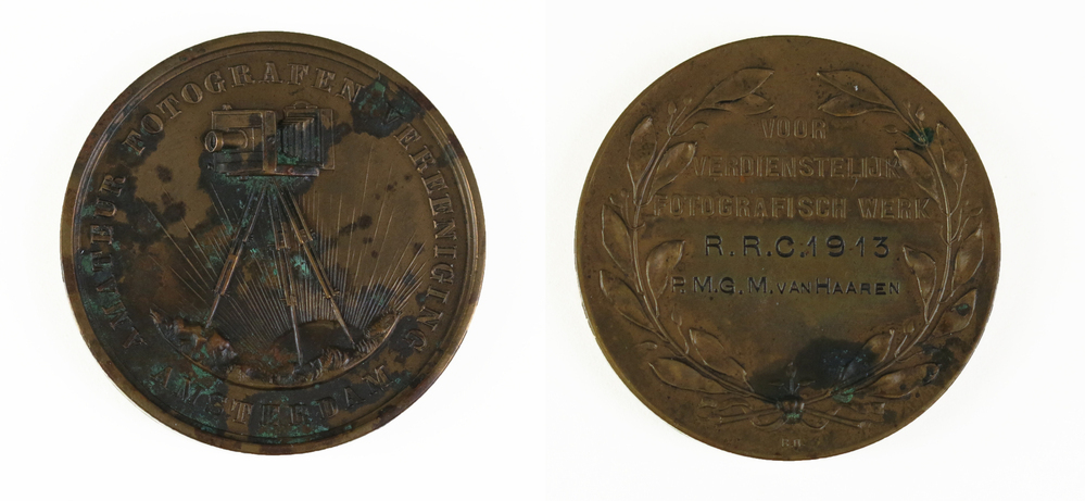 Deze bronzen penning is geslagen als prijspenning van de Amateur Fotografen Vereeniging Amsterdam in 1913. De prijs is toegekend aan de Nederlandse amateurfotograaf P.M.G.M. van Haaren (1859-1937) 'voor verdienstelijk fotografisch werk', zoals op de achterzijde van de penning te lezen is. Deze tekst en de naam van de winnaar zijn omringd door de takken van een lauwerkrans. Van Haaren was erelid van de Nederlandse Amateur Fotografen Vereniging en in de jaren twintig bestuurslid bij de Bond voor Nederlandse Amateur Fotografen Verenigingen (vaak afgekort tot Fotobond). De voorzijde van de penning toont een fototoestel op een statief, voor een achtergrond met een opkomende zon. Eromheen is de naam van de vereniging te lezen. ( Sarah Remmerts de Vries)