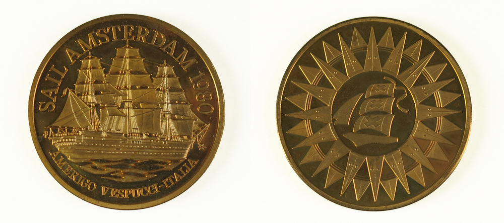 Deze bronzen penning is geslagen ter gelegenheid van de tweede editie van Sail Amsterdam in 1980. De eerste editie van Sail vond plaats in augustus 1975, om te vieren dat de stad Amsterdam 700 jaar bestond. Vanwege het grote succes werd besloten om vijf jaar later tot een tweede editie over te gaan, die volgens het programmaboekje ‘Nog groter van opzet, nog indrukwekkender’ was. Sindsdien is het maritieme evenement elke vijf jaar georganiseerd. In 1980 zijn een aantal penningen uitgegeven met afbeeldingen van opvallende schepen uit verschillende landen die Sail aandeden. Deze penning is daar één van en toont het Italiaanse zeilschip 'Amerigo Vespucci'. Op de keerzijde is het toenmalige logo van Sail te zien, omlijst door een dubbele stralenkrans. ( Sarah Remmerts de Vries)