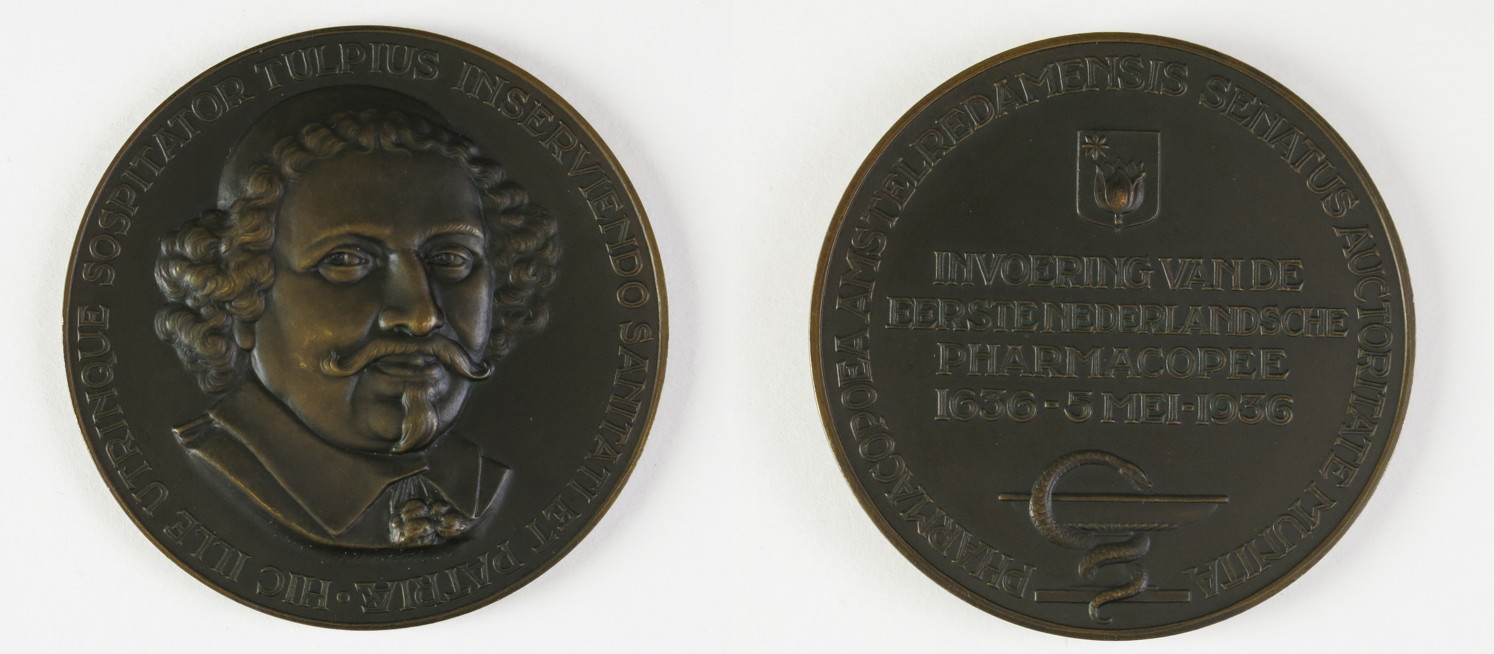 Deze bronzen penning is vervaardigd ter gelegenheid van het derde eeuwfeest van de invoering van de eerste Nederlandse farmacopee in 1936. Een farmacopee is een receptenboek met voorschriften voor het maken van medicijnen. De eerste nationale farmacopee, de Pharmacopoea Amstelredamensis, is uitgegeven in 1636 op initiatief van de Amsterdamse arts en burgemeester Nicolaes Tulp (1593-1674). Het is dan ook Tulp die afgebeeld is op de voorzijde van deze penning. Om hem heen is de Latijnse tekst HIC ILLE UTRINQUE SOSPITATOR TULPIUS INSERVIENDO SANITATI ET PATRIAE (‘Dit is Tulp, beschermer van de gezondheidszorg en het vaderland’) te lezen. De keerzijde van de penning toont eveneens een Latijnse tekst: PHARMACOPOEA AMSTELREDAMENSIS SENATUS AUCTORITATE MUNITA (‘Het gezag van de senaat is verrijkt door de Pharmacopoea Amstelredamensis’). Een tekst in het midden van de keerzijde herinnert aan het derde eeuwfeest van de invoering van de farmacopee. Tot slot zijn hier nog een wapen van de familie Tulp en een esculaap te zien, de laatste afgebeeld met een bokaal in plaats van een staf. ( Sarah Remmerts de Vries)