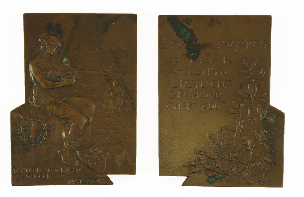 De amateurfotograaf P.M.G.M. van Haaren (1859-1937) won in maart 1906 de eerste prijs 'Kunstlicht opnames'. Van Haaren was erelid van de Nederlandse Amateur Fotografen Vereniging en in de jaren twintig bestuurslid bij de Bond voor Nederlandse Amateur Fotografen Verenigingen (vaak afgekort tot Fotobond). De voorzijde van de plaquette toont een vrouw met fototoestel. In de achtergrond het onderwerp van de foto: een molenlandschap met een boerenechtpaar. ( Judith van Gent)