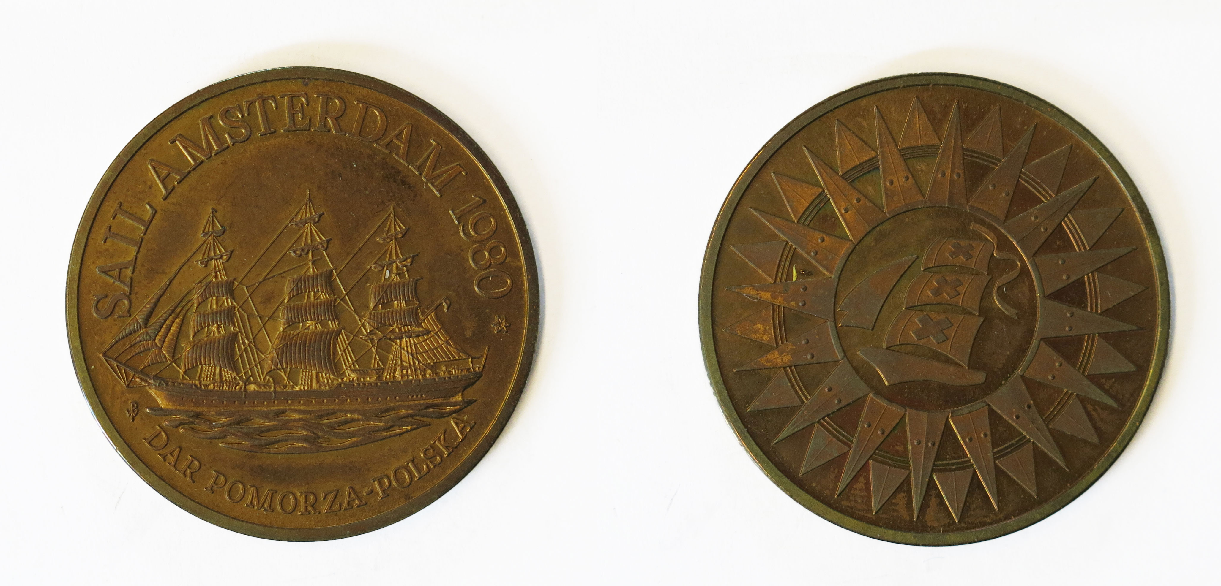 Deze bronzen penning is geslagen ter gelegenheid van de tweede editie van Sail Amsterdam in 1980. De eerste editie van Sail vond plaats in augustus 1975, om te vieren dat de stad Amsterdam 700 jaar bestond. Vanwege het grote succes werd besloten om vijf jaar later tot een tweede editie over te gaan, die volgens het programmaboekje ‘Nog groter van opzet, nog indrukwekkender’ was. Sindsdien is het maritieme evenement elke vijf jaar georganiseerd. In 1980 zijn een aantal penningen uitgegeven met afbeeldingen van opvallende schepen uit verschillende landen die Sail aandeden. Deze penning is daar één van en toont het Poolse zeilschip 'Dar Pomorza'. Op de keerzijde is het toenmalige logo van Sail te zien, omlijst door een dubbele stralenkrans. ( Sarah Remmerts de Vries)