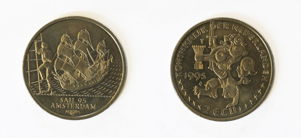 keerzijde: een omschrift waarbinnen een leeuw met in de rechterklauw een zwaard en in de linkerklauw 7 pijlen vasthoudend die de 7 provincien voorstellen. Onder de bos pijlen het jaartal 1995. Voorzien van een muntteken en een muntmeesterteken.