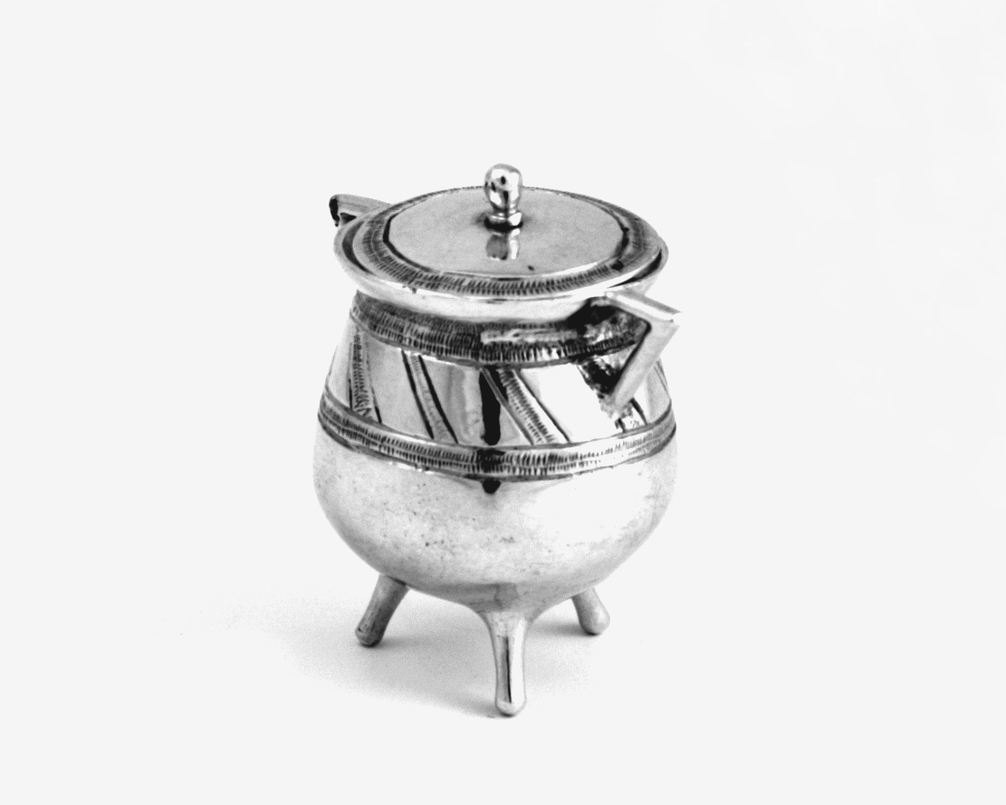 Ronde pot op drie pootjes, gladde bolvormige onderzijde van de wand inlopend naar boven, versierd met bandgravering waartussen een diagonale band, naar buiten staande sluitrand, twee scherphoekige oren, deksel met randgravering en eenvoudig knopje.