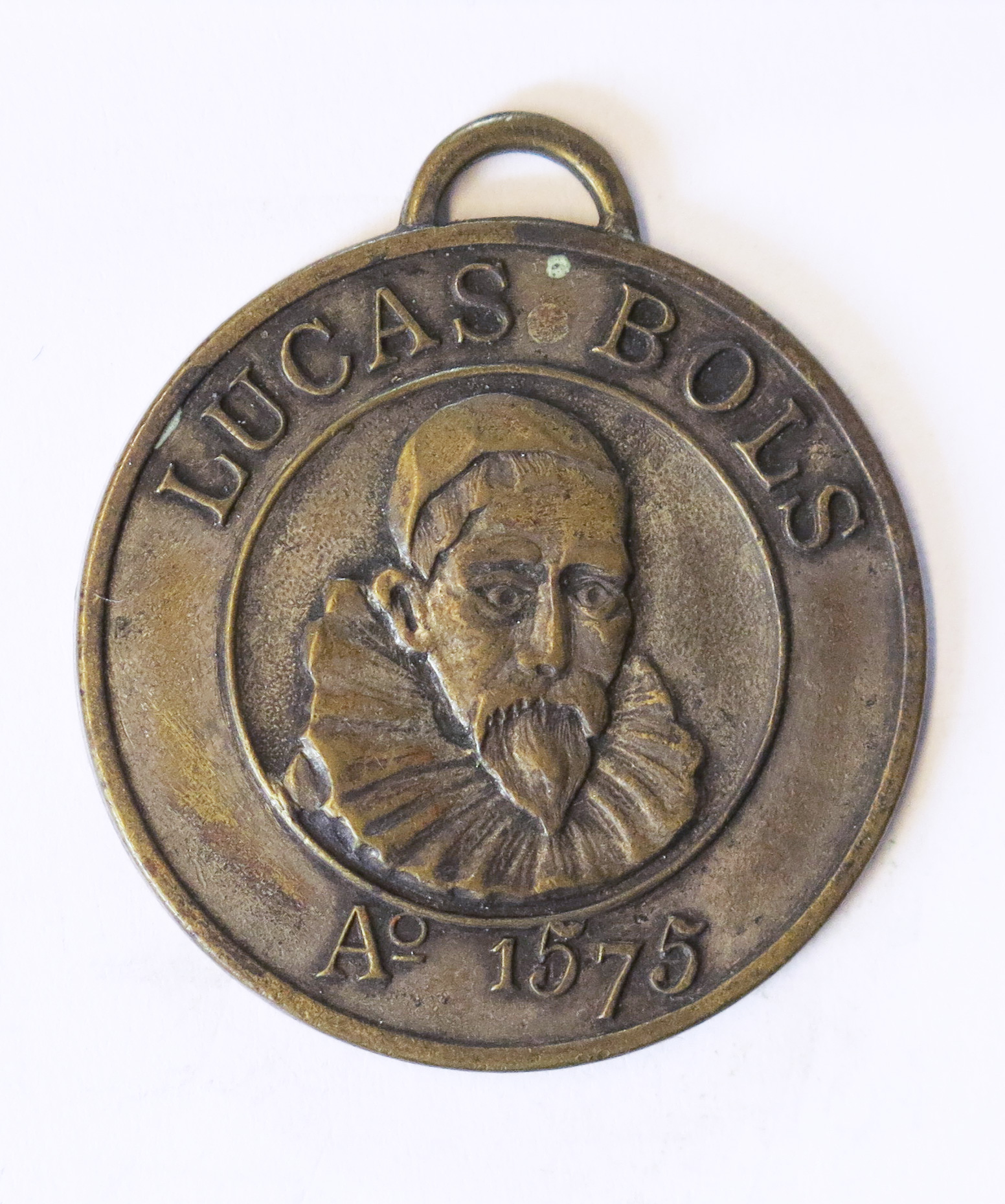 Deze draagpenning is uitgegeven door het Amsterdamse destillateursbedrijf Lucas Bols. In 1575 opende de familie Bols een kleine stokerij aan de Rozengracht, genaamd ‘het Lootsje’. Kleinzoon Lucas Bols (1652-1719) wist het familiebedrijf in de Gouden Eeuw internationale bekendheid te geven. Zo startte hij met de productie van jenever, waar Bols nu nog steeds om bekend staat. Ook was hij grootaandeelhouder van de Vereenigde Oostindische Compagnie (VOC), waardoor hij gemakkelijk aan kruiden en specerijen kon komen voor zijn likeuren. Het bedrijf draagt tegenwoordig nog steeds zijn naam. Op de voorzijde van de penning is een naar rechts gewend portret van Lucas Bols te zien, met erboven de naam van het bedrijf en eronder het jaartal van oprichting. De keerzijde is een glad veld met de mogelijkheid tot inscriptie. ( Sarah Remmerts de Vries)
