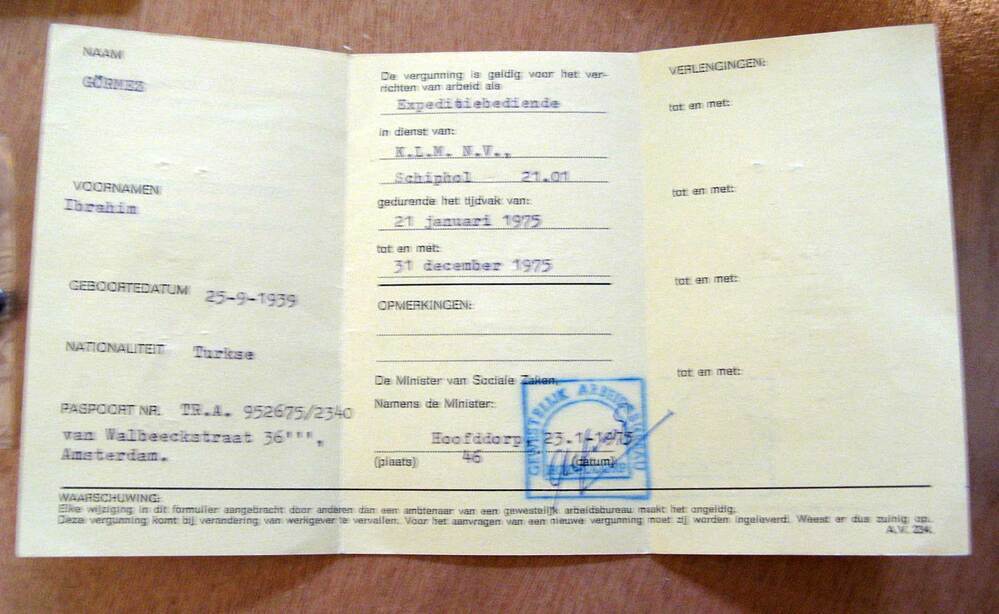 Deze arbeidsvergunning is in de museumcollectie opgenomen in het kader van de tentoonstelling '100 Jaar Schiphol. Klaar voor vertrek', die van 16 september 2016 tot en met 7 mei 2017 te zien was in het Amsterdam Museum. Op Schiphol werken zo’n 65.000 mensen. Al die mensen hebben een speciaal pasje. Ibrahim Görmez was één van de eerste Turkse gastarbeiders in Amsterdam. Hij kwam in 1964 aan op Schiphol en ging er in 1970 op de bagageafdeling werken. Het was een zwaar beroep, want alles moest nog met de hand worden getild. ( Sarah en Hasselt Remmerts de Vries, Laura van)