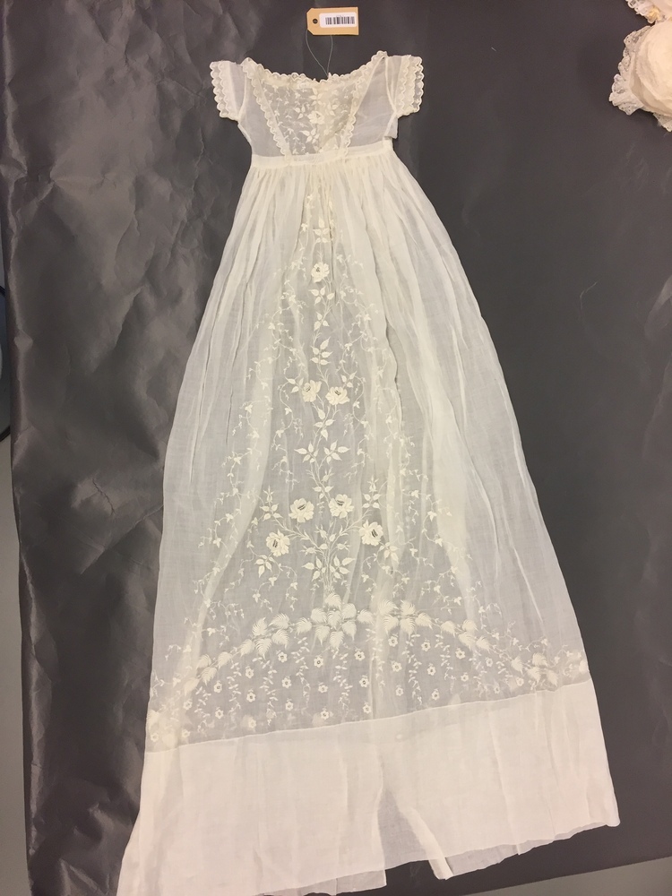 Deze doopjurk is door de Amsterdamse Maria Elisabeth Kotting-Gude in 1833 vervaardigd voor de doop van haar eerste kleinkind. Haar zoon Jan Ludolph Kotting (1809-1841) kreeg zeven kinderen, die allen in deze doopjurk zijn gedoopt. De jurk bleef ook daarna in de familie. Jans dochter Christina Kotting, die in 1868 trouwde met Adrianus Nieuwenkamp, kreeg eveneens zeven kinderen, die allen in dezelfde jurk zijn gedoopt. En ook enkele van Christina’s kleinkinderen, onder wie de moeder van de schenker, hebben de jurk op hun beurt weer mogen dragen. Zo is de doopjurk tot aan het begin van de twintigste eeuw in gebruik gebleven. Bij de doopjurk horen tevens een katoenen onderkleed, een geborduurd batisten overkleed, een geborduurde batisten draagdoek, twee bijbehorende mutsjes en twee tule mitaines. ( Sarah Remmerts de Vries)