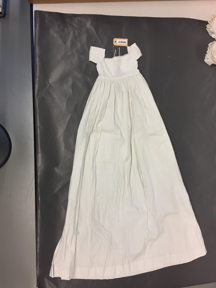 Deze doopjurk is door de Amsterdamse Maria Elisabeth Kotting-Gude in 1833 vervaardigd voor de doop van haar eerste kleinkind. Haar zoon Jan Ludolph Kotting (1809-1841) kreeg zeven kinderen, die allen in deze doopjurk zijn gedoopt. De jurk bleef ook daarna in de familie. Jans dochter Christina Kotting, die in 1868 trouwde met Adrianus Nieuwenkamp, kreeg eveneens zeven kinderen, die allen in dezelfde jurk zijn gedoopt. En ook enkele van Christina’s kleinkinderen, onder wie de moeder van de schenker, hebben de jurk op hun beurt weer mogen dragen. Zo is de doopjurk tot aan het begin van de twintigste eeuw in gebruik gebleven. Bij de doopjurk horen tevens een katoenen onderkleed, een geborduurd batisten overkleed, een geborduurde batisten draagdoek, twee bijbehorende mutsjes en twee tule mitaines. ( Sarah Remmerts de Vries)