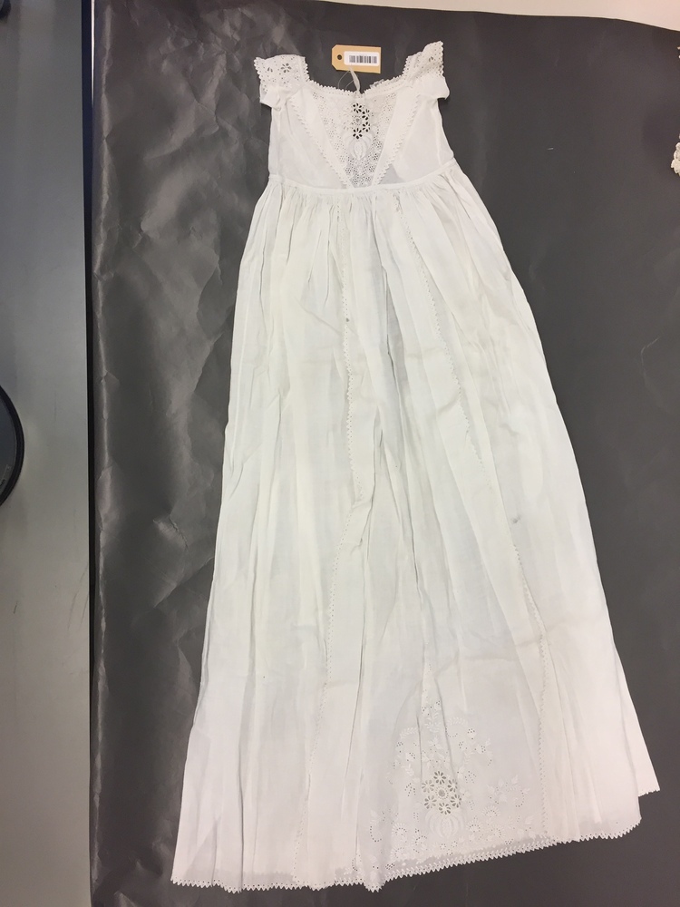 Deze doopjurk is door de Amsterdamse Maria Elisabeth Kotting-Gude in 1833 vervaardigd voor de doop van haar eerste kleinkind. Haar zoon Jan Ludolph Kotting (1809-1841) kreeg zeven kinderen, die allen in deze doopjurk zijn gedoopt. De jurk bleef ook daarna in de familie. Jans dochter Christina Kotting, die in 1868 trouwde met Adrianus Nieuwenkamp, kreeg eveneens zeven kinderen, die allen in dezelfde jurk zijn gedoopt. En ook enkele van Christina’s kleinkinderen, onder wie de moeder van de schenker, hebben de jurk op hun beurt weer mogen dragen. Zo is de doopjurk tot aan het begin van de twintigste eeuw in gebruik gebleven. Bij de doopjurk horen tevens een katoenen onderkleed, een geborduurd batisten overkleed, een geborduurde batisten draagdoek, twee bijbehorende mutsjes en twee tule mitaines. ( Sarah Remmerts de Vries)