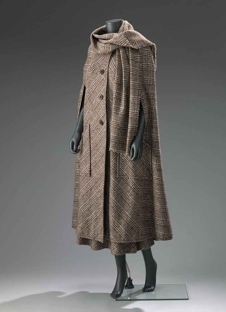 Dit ensemble is ontworpen door Max Heymans (1918-1997), een van de belangrijkste Nederlandse couturiers. Hij werkte vanaf de jaren dertig van de twintigste eeuw in Amsterdam, als hoedenmaker voor onder meer Maison de Bonneterie en etaleur voor modemagazijn Hirsch & Cie. In de jaren vijftig en zestig werd Heymans in het hele land bekend met zijn flamboyante kledingcreaties in de stijl van zijn Franse voorbeeld Coco Chanel. Heymans bleef maar liefst vijftig jaar lang actief als couturier en showde in deze tijd ruim 8000 verschillende creaties. Zijn werk was altijd geïnspireerd op de nieuwste Parijse mode en is wel eens omschreven als 'très Paris' en 'doodchic'. Dit ensemble bestaat uit een cape, rok en sjaal in zwart-wit geruite stof. De cape fungeert, eventueel in combinatie met de sjaal, als een jas voor buiten. ( Sarah Remmerts de Vries)