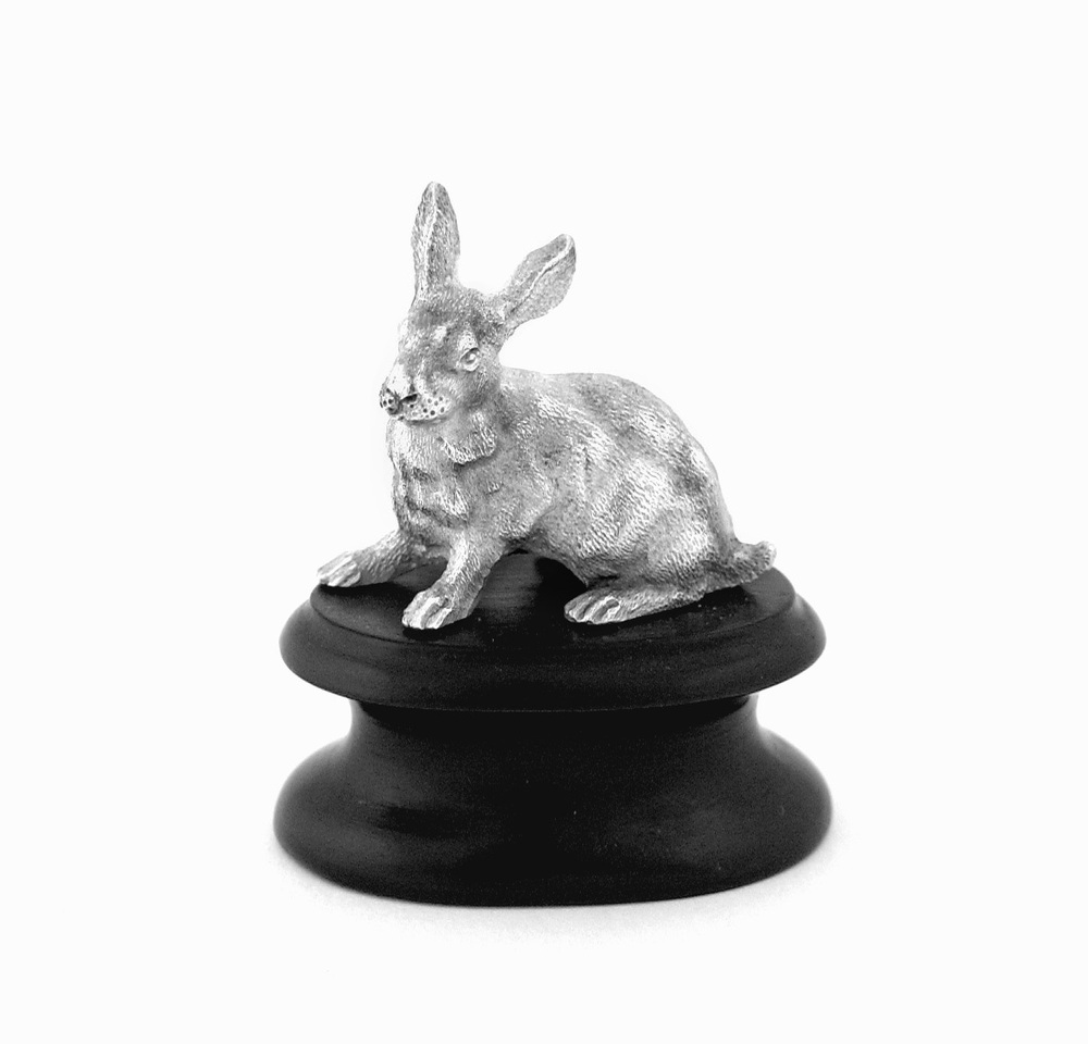 Op achterpoot zittend konijn op ovaal zwarthouten sokkeltje- Trefwoorden