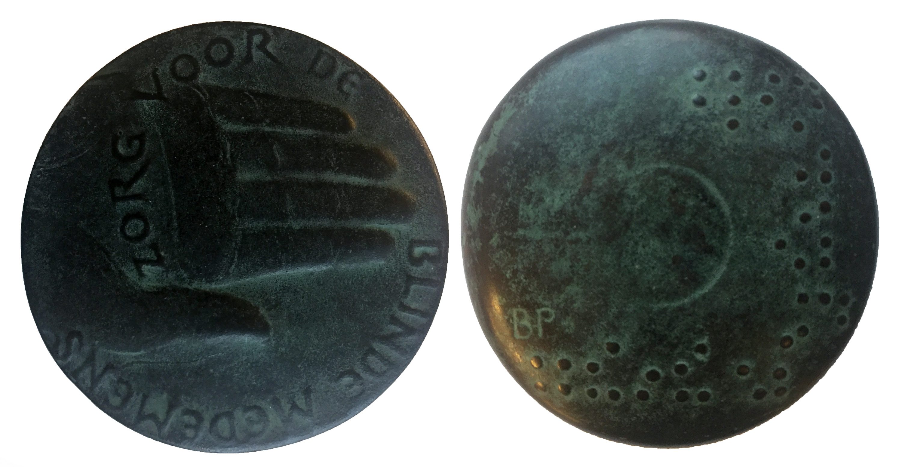 Deze bronzen penning is vervaardigd in opdracht van het bestuur van de Stichting Blinden-Penning, een fonds en organisator van recreatieve activiteiten voor mensen met een visuele beperking. De stichting werd in 1865 op particulier initiatief opgericht als werkplaats voor blinden. Deze penning, met een diameter van 8 cm en een gewicht van 300 gram, wordt uitgereikt aan personen die zich verdienstelijk hebben gemaakt voor de stichting. De voorzijde van de penning toont een afbeelding van een hand met eromheen de tekst: ‘Zorg voor de blinde medemens’. Op de keerzijde is in brailleschrift de tekst ‘Blinden-Penning’ te voelen. De kleine letters ‘BP’, die op de keerzijde afgebeeld zijn, vormen een in het verleden veelgebruikte afkorting voor de naam van de stichting. ( Sarah Remmerts de Vries)
